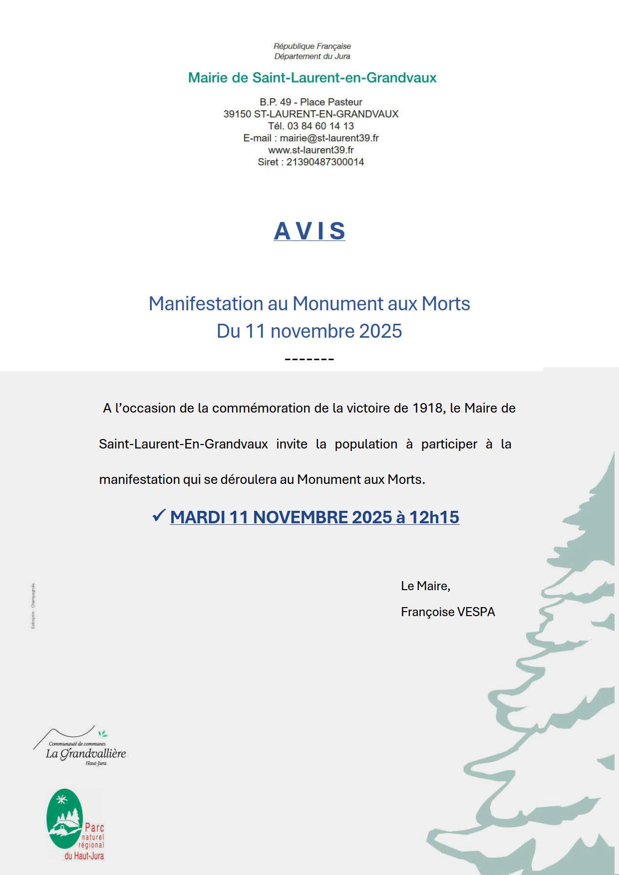 A l’occasion de la commémoration de la victoire de 1918, Madame le Maire de Saint-Laurent-en-Grandvaux invite la population à participer à la manifestation qui se déroulera au Monument aux...