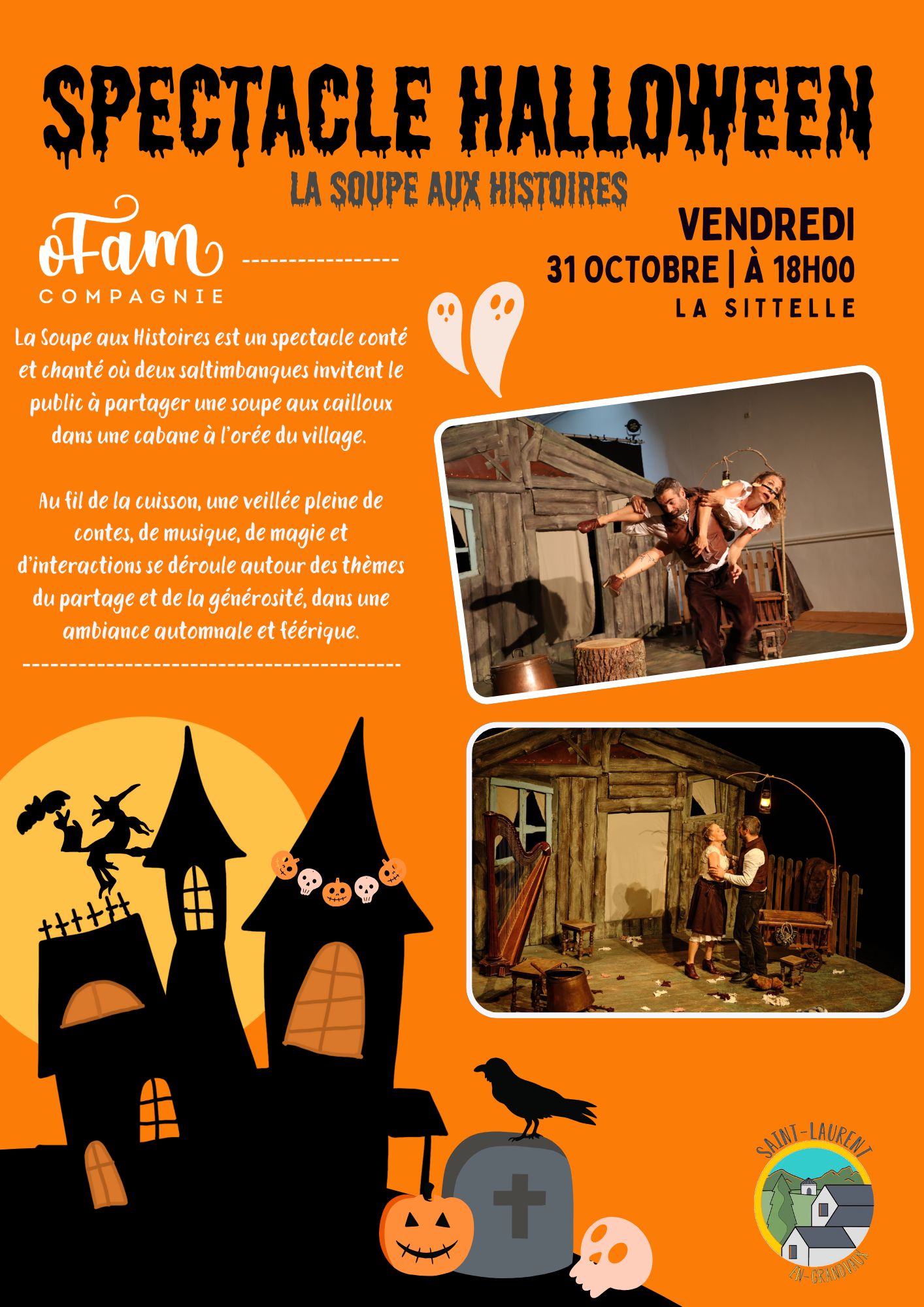 🎃 Vendredi 31 octobre – 18h – La SittelleOn vous attend pour le spectacle « La Soupe aux Histoires » 🥣Deux saltimbanques, une soupe un peu bizarre… et quelques frissons au passage...